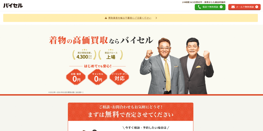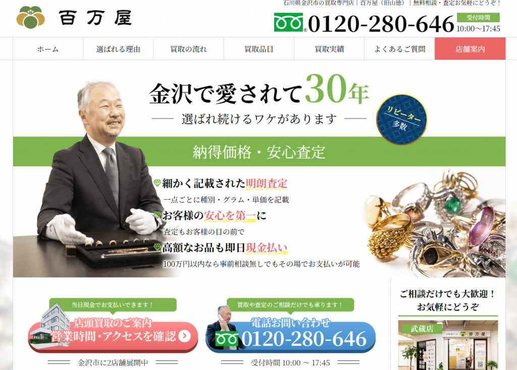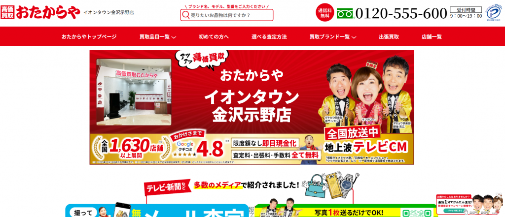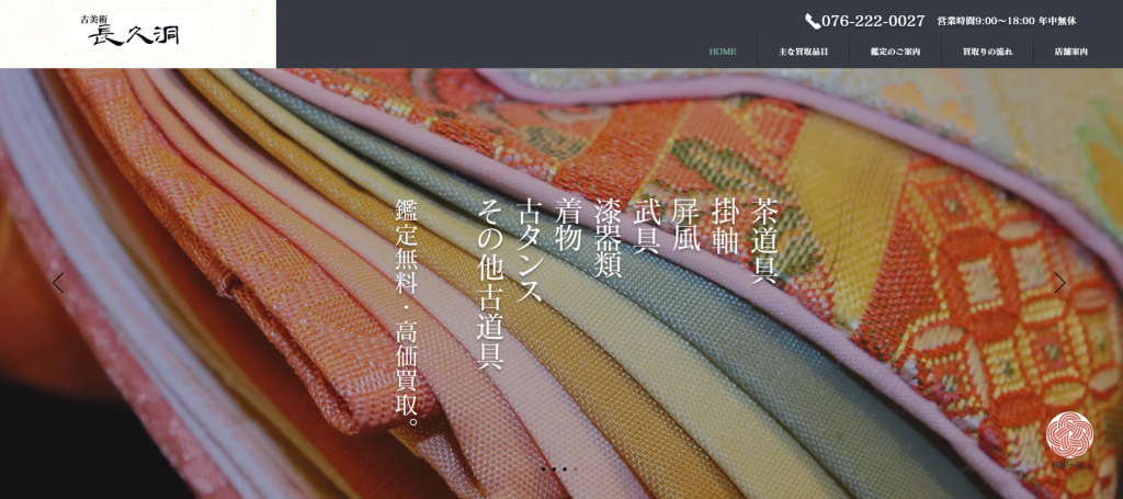 全国ほぼ対応(石川県全域も対象とされるケースが多い)全国対応の宅配キット・宅配買取に対応店頭買取・出張買取・宅配買取​査定料・出張料・宅配キットなどは無料のケースが多い着物を含む総合買取(ブランド品・貴金属・骨董など)全国規模での出張網と広告露出があり、「まず相見積もりの1社」として選びやすい石川県内の出張対象か・店頭拠点の場所を確認しつつ、他社との相見積もり候補にしやすい電話受付24時間365日(通話料無料)0120-612-773