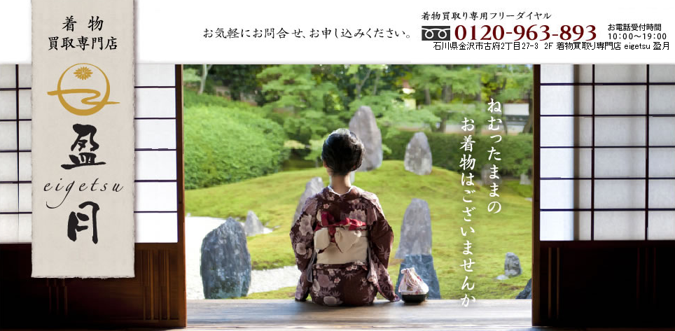 eigetsu盈月石川・富山・福井中心全国から送料無料で宅配買取対応宅配買取・出張買取相談・送料はすべて無料着物専門(伝統工芸・有名作家・アンティーク・振袖・帯・小物など)伝統工芸品・有名作家物からアンティーク着物まで幅広く取り扱う〒920-0362