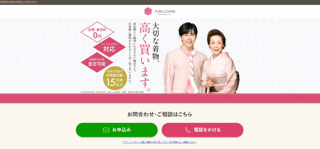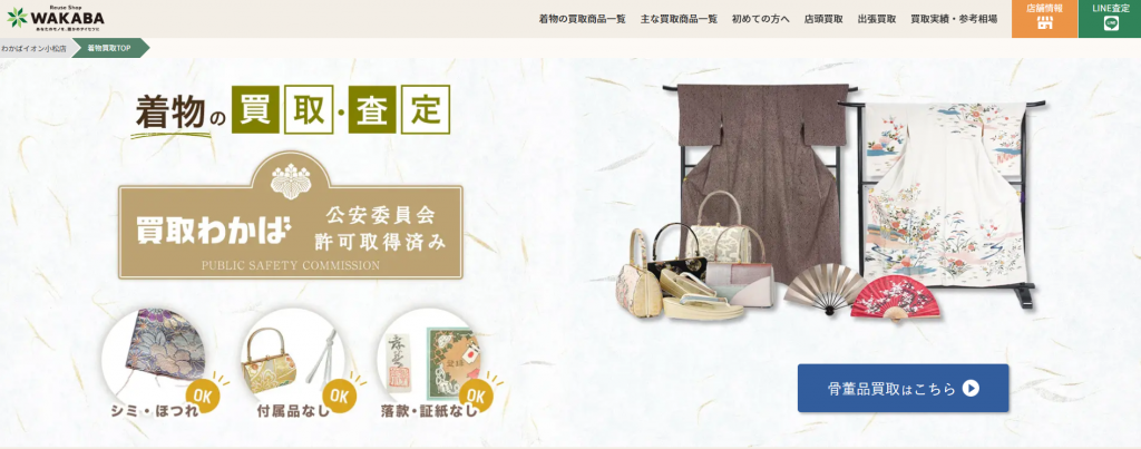 全国対応の出張買取を案内宅配買取サービスあり(※一部受付制限の告知あり)店頭買取・出張買取・宅配買取​査定に関する料金は無料と明示(出張・宅配とも)着物(和服全般と小道具)に加えて、食器・ブランド品・古銭・レコード・カメラ・楽器など幅広く対応着物専用ページや買取実績が豊富で相談しやすい石川の着物を含め「まとめ売り」したい場合や、宅配で一気に送りたい場合に相性が良いWeb申し込みは24時間受け付け問い合わせは主にWebフォーム経由