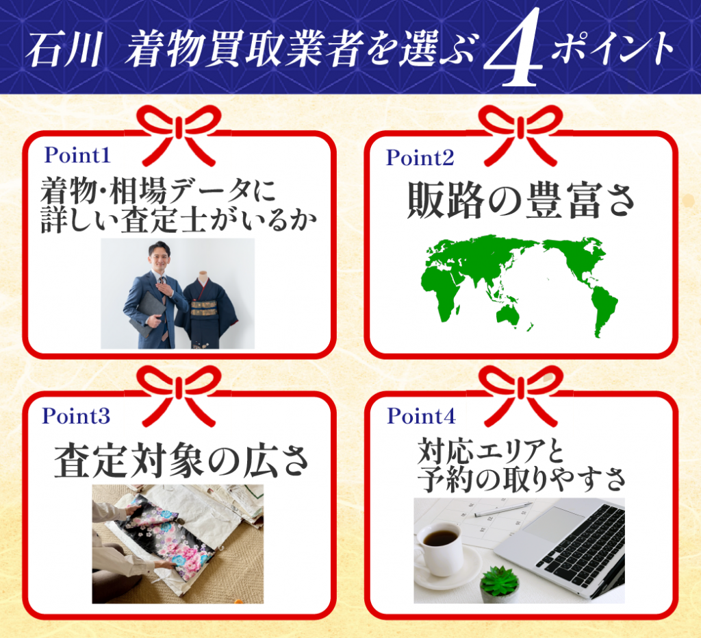 この着物買取業者で売るメリット買取実績・販路が大きく、相場に沿った安定した価格になりやすい石川の着物文化・産地・作家に詳しく、目利きに期待しやすい