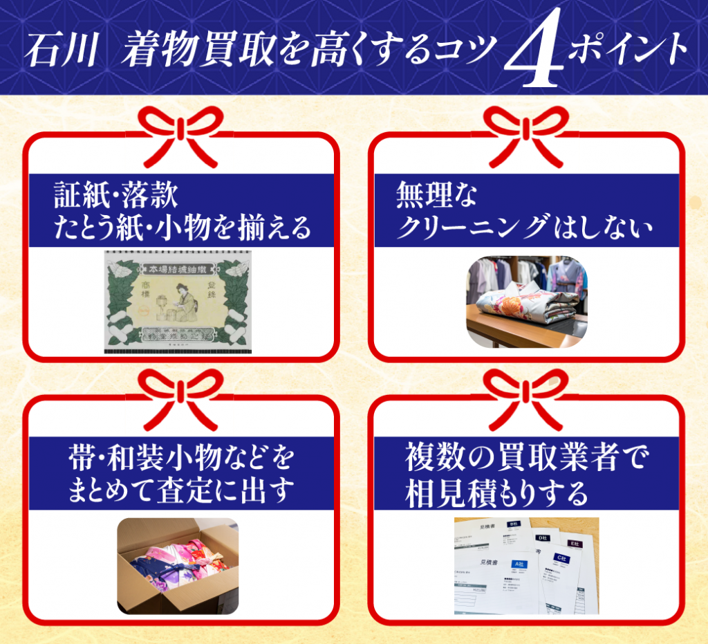石川で着物をできるだけ高く着物を売るには、方法(持ち込み・出張・宅配)×業者(全国対応・金沢店舗)×相見積もりの三つを組み合わせるのが重要です。