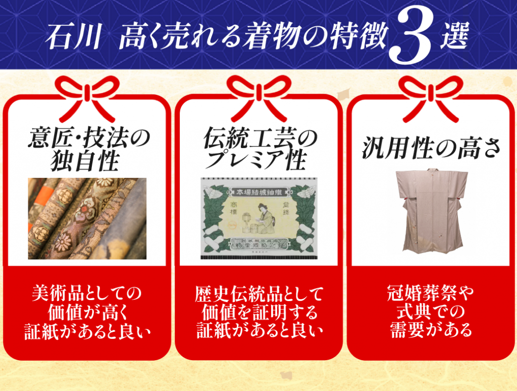 石川ゆかりの着物・工芸の評価されやすいポイントは、意匠や技法の独自性・伝統工芸としてのプレミア性・汎用性の高さです。