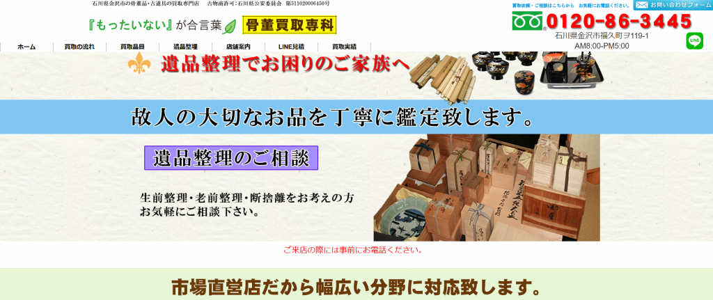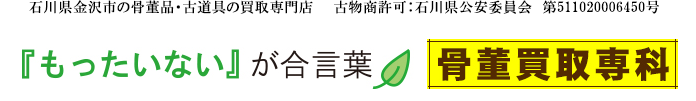 金沢骨董買取専科石川・富山・福井中心出張買取・店頭買取店舗にお問い合わせください骨董・古美術・茶道具・陶磁器・着物などの最新相場に強い骨董や古美術に強く、他店で断られる品も買取対象になる場合がある〒920-3122